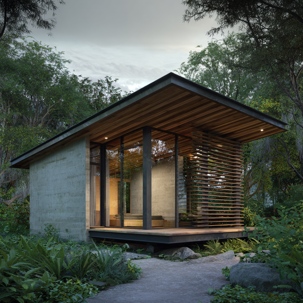 A serene retreat designed for immersion in nature. With its wide glazing, deep brow, and timber accents, the Forest Studio balances privacy and openness — ideal for a home office, guest space, or quiet creative hideaway.