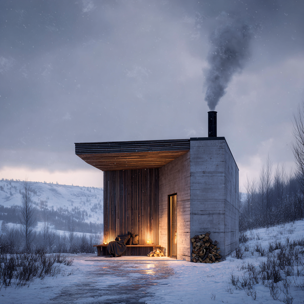 Crafted for resilience in extreme climates, the Alpine Cabin pairs raw concrete with warm timber interiors. With its compact footprint and high thermal performance, it offers comfort, protection, and character even in the harshest winters.