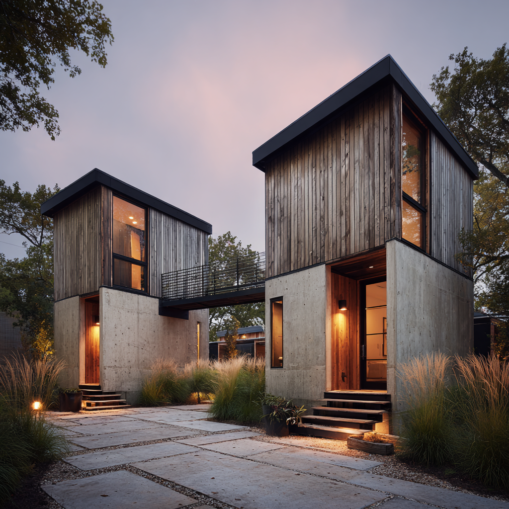 Two modular towers linked by a light bridge, designed for families or partners who want independence with connection. The Twin House offers vertical living with a shared courtyard, blending privacy, openness, and architectural drama.